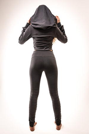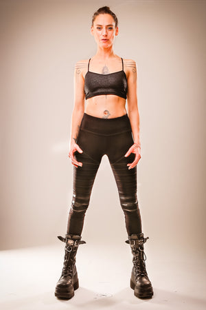 The Asashin Leggings has beautifully designed elements which give the pant a very cool appearance. With the ribs and the knee elements its the perfect fit for every Cyberpunk Goth Outfit. The black in black Sacred Geometry Print makes this Pant very unique. The back stitching was inspired by Leggings from the 1920s or Steampunk Style.