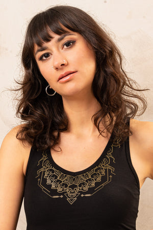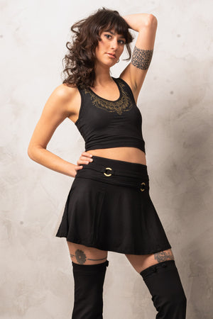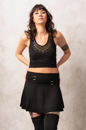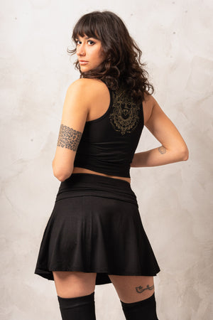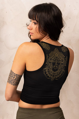 Hey there, goddesses! This half top is the ultimate statement piece for all the fierce ladies out there. Featuring a stunning golden print of the one and only Kali, this crop top is sure to turn heads. The design is made up of sacred geometric structures, making this top a true work of art. Plus, the chain of skulls in the front is an epic detail that's straight out of Kali's wardrobe.